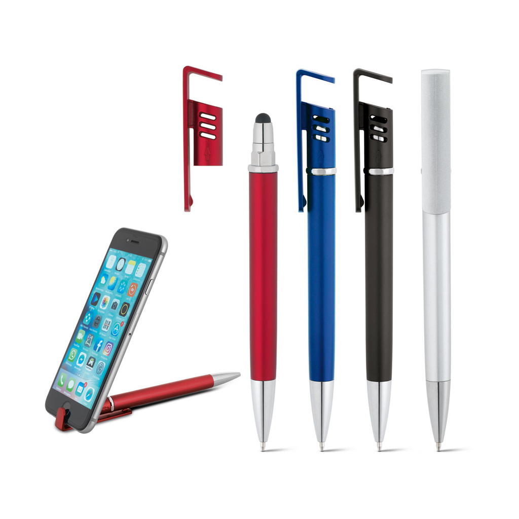- Stylo à bille à finition métallique, pointe tactile et support pour téléphone portable
