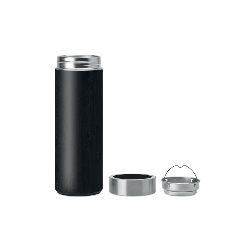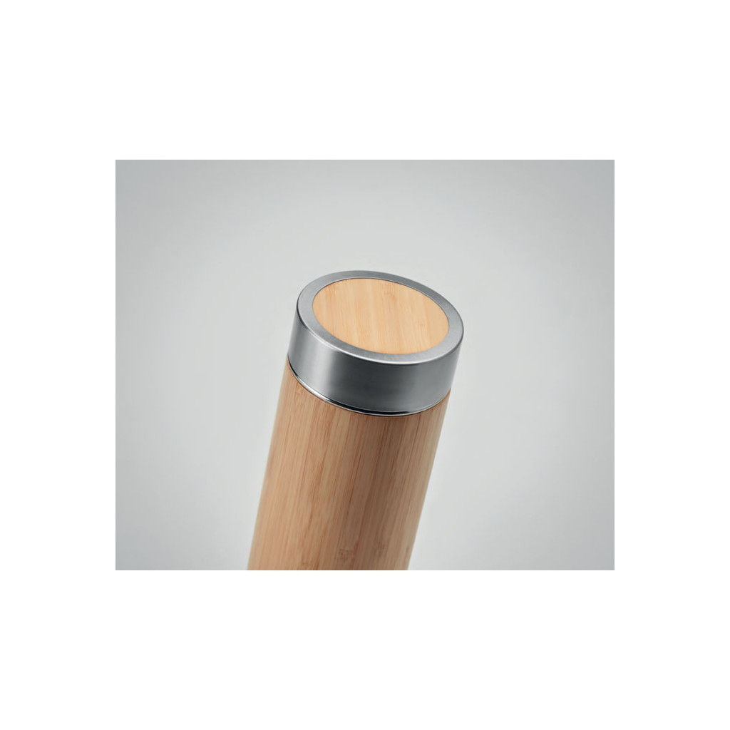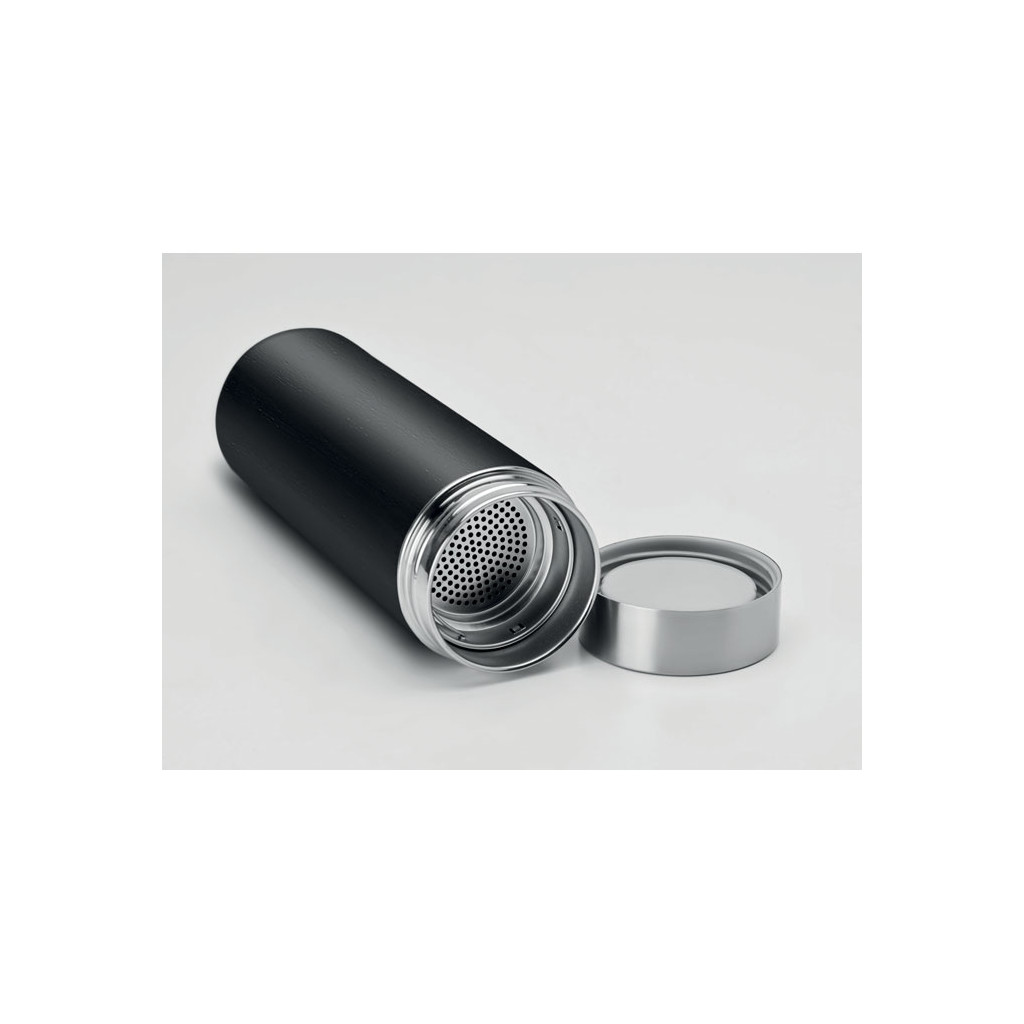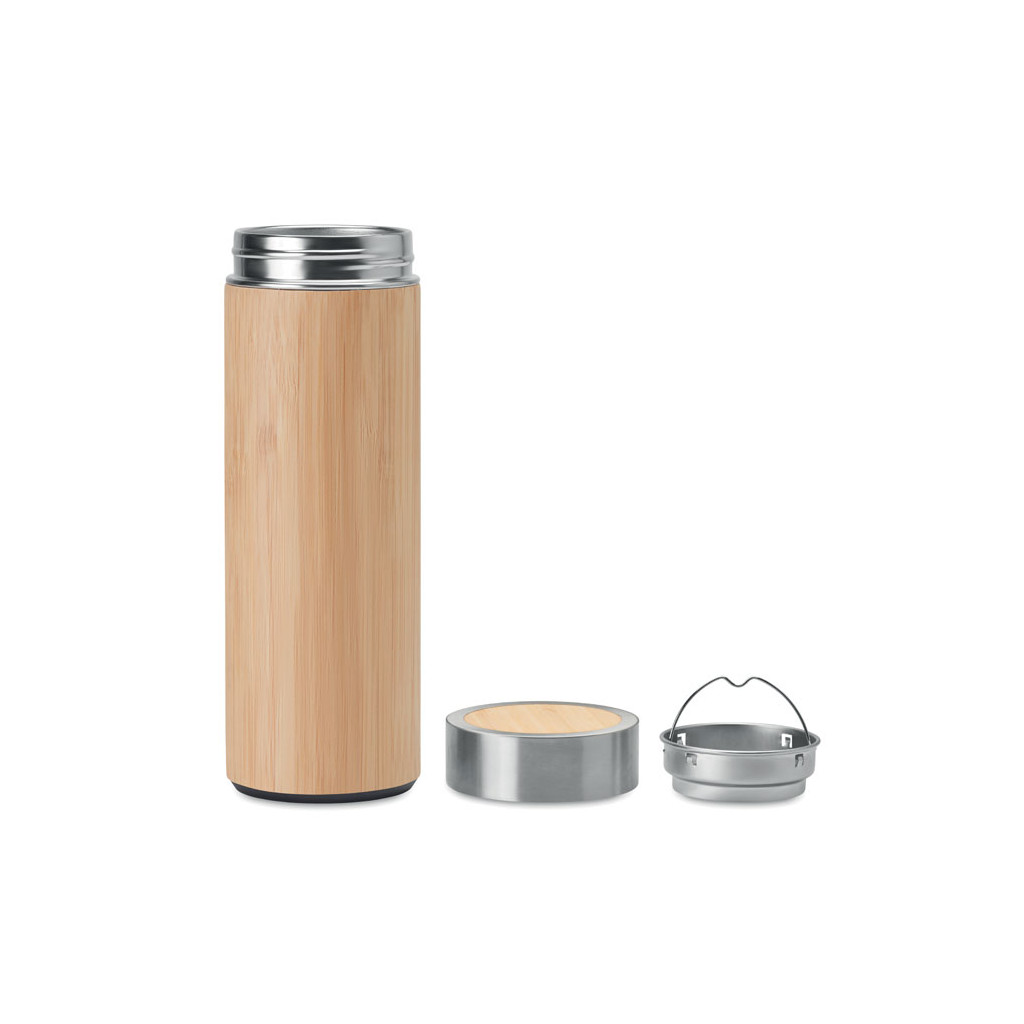 - Gourde double paroi Inox avec couvercle isolant en bambou et infuseur à thé