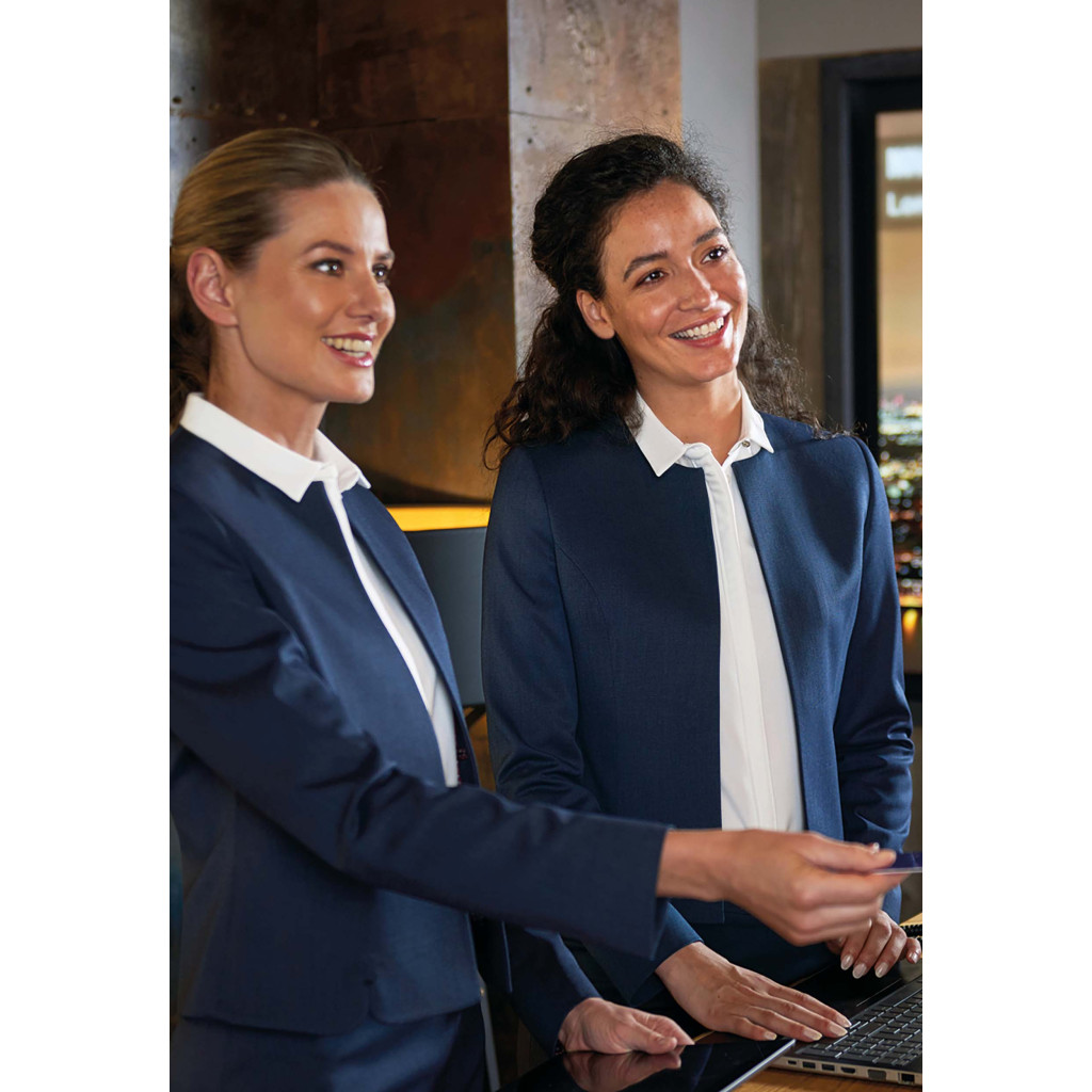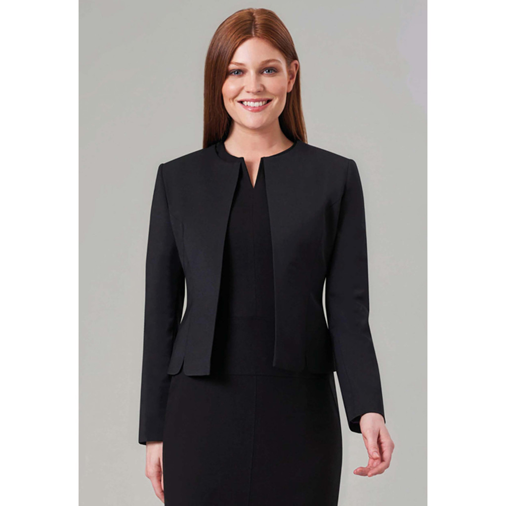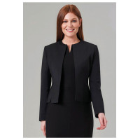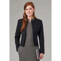 Veste sans col, 2 poches passepoilées à l'intérieur et coupe arrondie en bas.