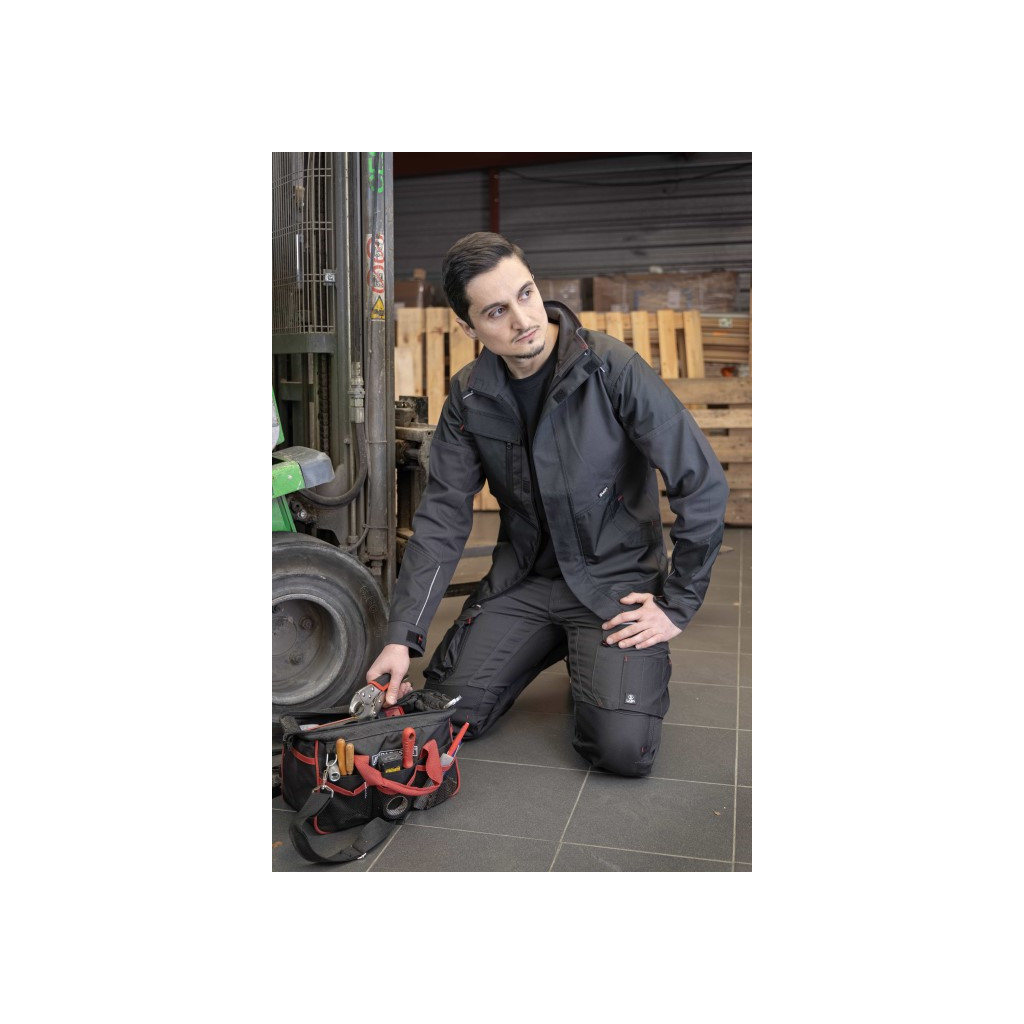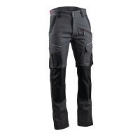 Découvrez ce pantalon de travail robuste avec fermeture bouton clou et braguette zippée. Ceinture ajustable sur les côtés avec élastique contrastant. Multiples poches pratiques dont poches mains renforcées et poche zippée en biais. Idéal pour les professionnels avec attache porte marteau et renforts aux genoux et bas de jambes.