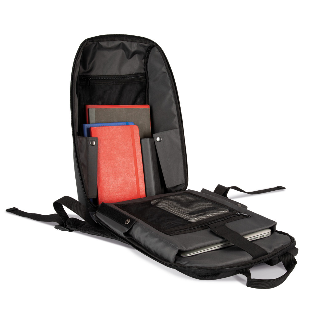 Ce sac à dos écoresponsable est conçu avec 50% de polyester recyclé, offrant une solution écologique pour vos besoins professionnels. Il comporte une poche avant personnalisable ainsi qu'une poche zippée dissimulée à l'arrière pour une sécurité accrue. Sa composition est entièrement en polyester.
