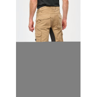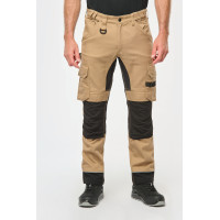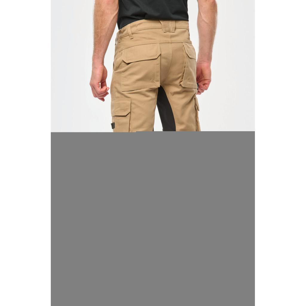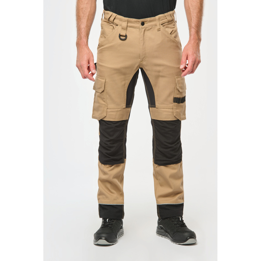 60% coton / 40% de polyester recyclé. Lavage 60°C. Coupe droite. 2 poches devant (sacs de poches en tissu principal) dont 1 avec poche ticket. 2 poches cargo volantes à soufflet et rabat et fermeture velcro dont une à 2 compartiments et emplacements outils, Poche stylos côté droit au porté. 2 poches arrière à soufflet avec rabat et fermeture velcro, Porte-marteau à gauche au porté. Mousse de confort genou intégrée dans une poche en Cordura contrasté ( noir pour toutes les couleurs). Empiècement extensible contrasté (sauf coloris noir) à l'entrejambe, à l'arrière des genoux pour plus de résistance et une parfaite liberté de mouvement. Empiècement bas de jambe en Cordura® avec piping silver et ourlet ajustable de 5 cm. Triple piqûres fourche dos et devant. Double piqûres côtés et entrejambe. Ceinture avec boucle plastique + passants ajustable grâce à un élastique. Large passant à l'arrière de la ceinture. Fermeture zippée et boutonnée (bouton métal recouvert de plastique). Etiquette de marque détachable.