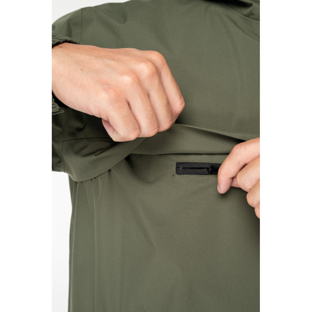 - Cordon de serrage avec stoppeurs recyclés à l'intérieur de la capuche et au bas du vêtement côté gauche au porté