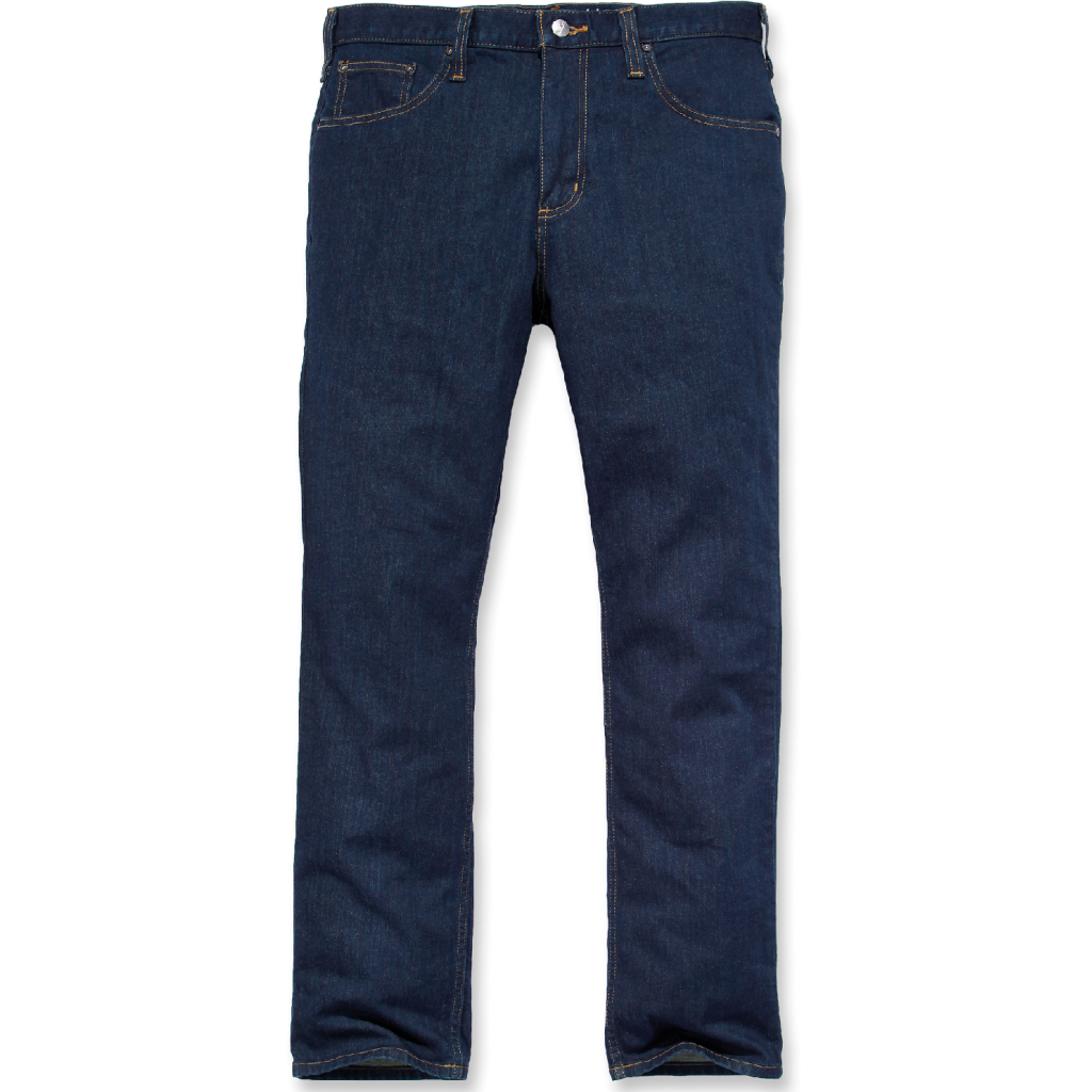 Pantalon Carhartt réf. CAR102807 en denim stretch, composé de 85 % coton, 14 % polyester et 1 % spandex pour un confort optimal et une bonne liberté de mouvement.