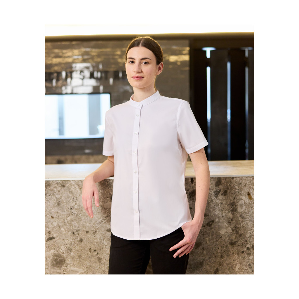 Cette chemisette à manches courtes réinvente le vêtement d'image pour femme avec son design minimaliste et sa fermeture boutonnée sous rabat pour un rendu épuré.