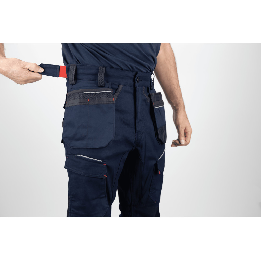 - Fonctionnalités : Poche cuisse gauche à soufflet, poche mètre, porte-stylo et anneau porte-clés.