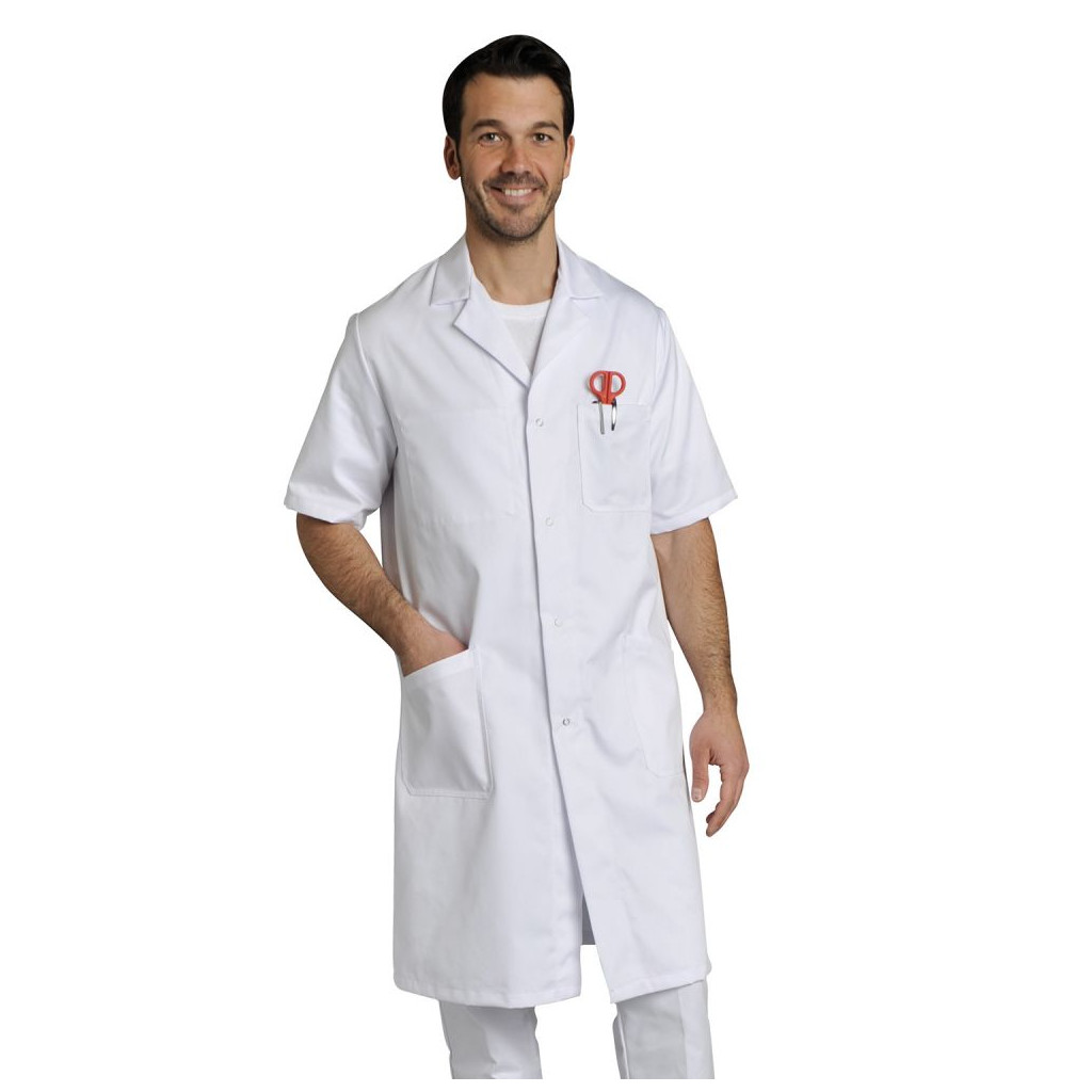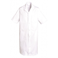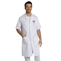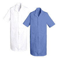 Elle est composé à 65% en polyester et 35% coton. Cette blouse se caractérise par une bonne longueur de 150cm au dos, une poche poitrine intérieur et à l'extérieur, deux poches basses et une fermeture à l'avant par boutons pressions.