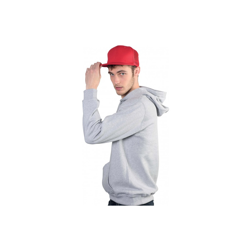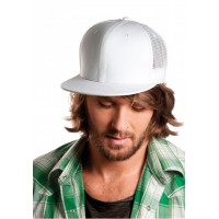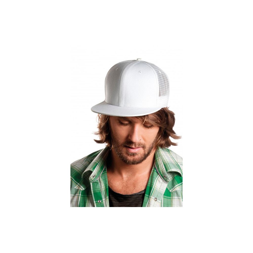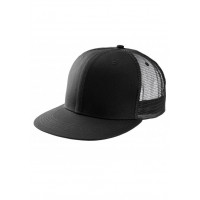 Casquette 6 panneaux 100% coton et filet 100% polyester. Visière plate. Bande de transpiration doublée en coton. Languette de réglage en plastique.