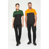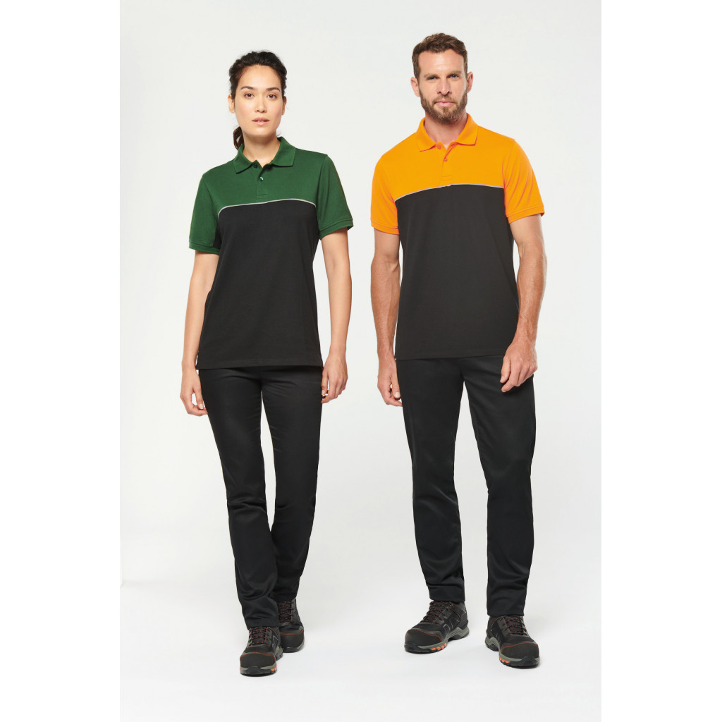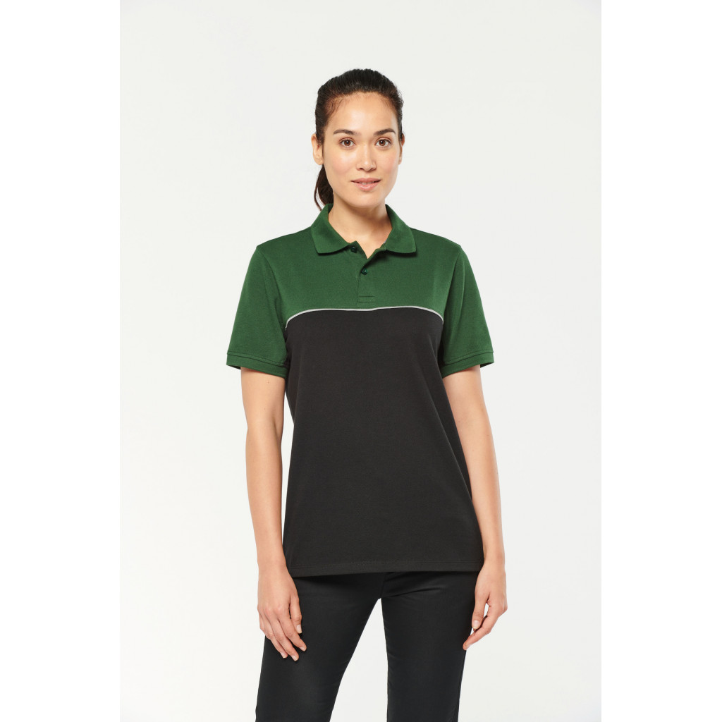 - Passepoil contrasté entre les parties bicolores du vêtement (corps, devant et dos)