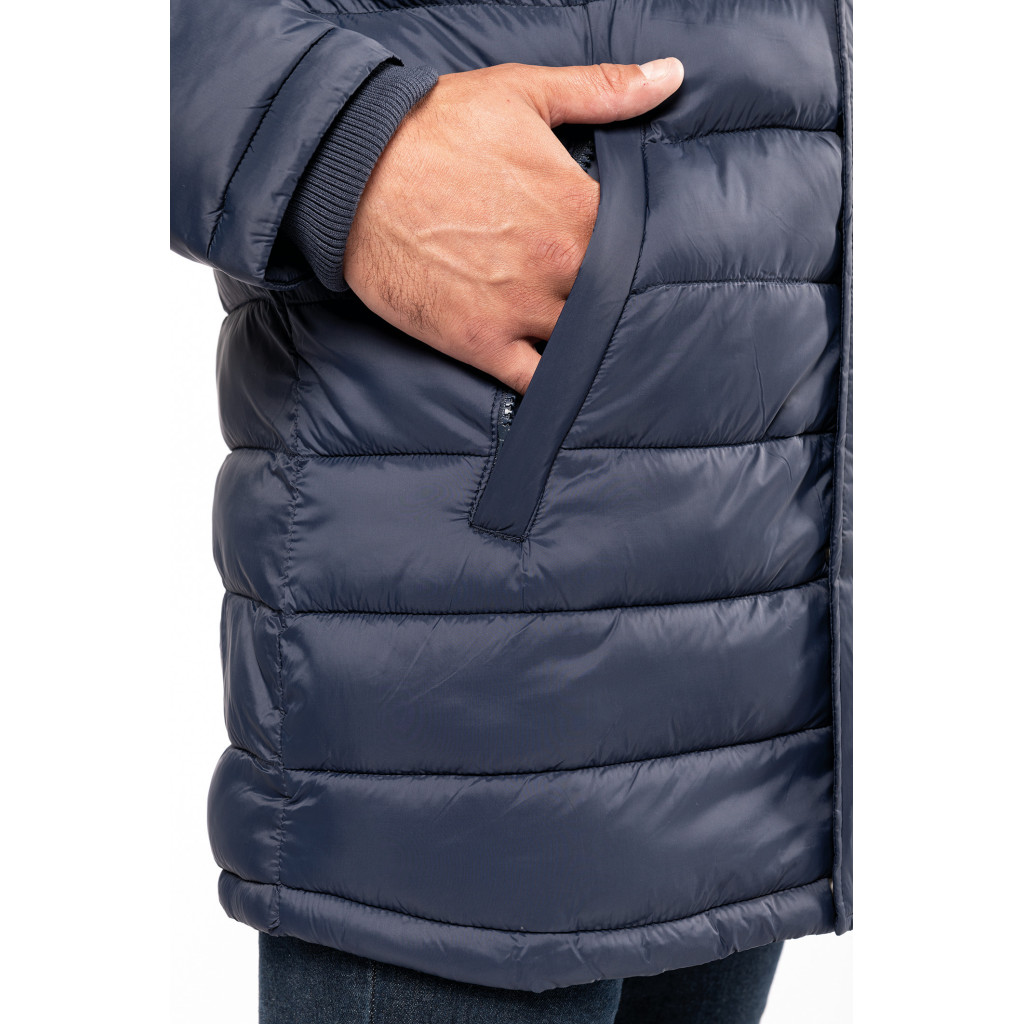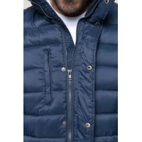 - Chaude et ultralégère. 2 poches devant et 1 poche poitrine zippées et passepoilées.