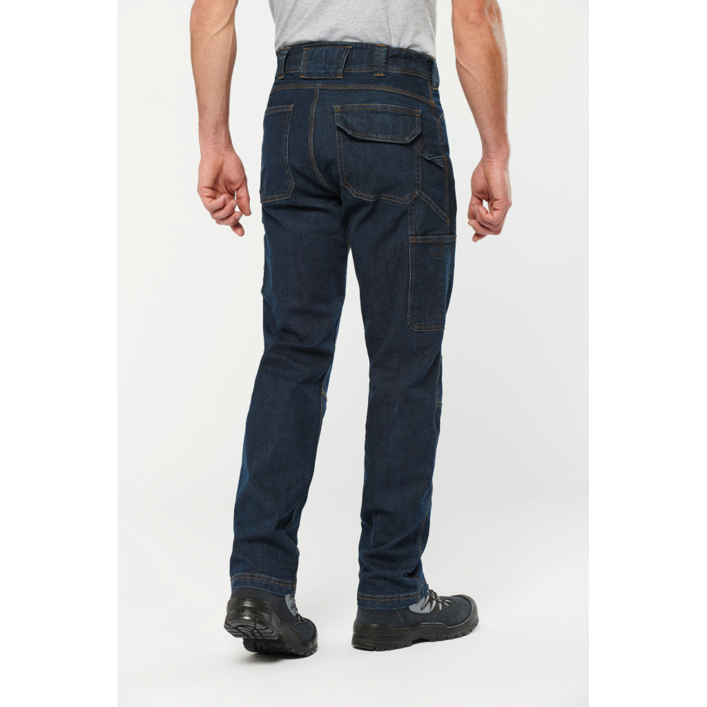 - Côté droit : passe-marteau, poche mètre + surpoche avec fermeture auto-agrippante. Dos : 2 poches plaquées avec coutures renforcées dont une à rabat avec bande auto-agrippante.