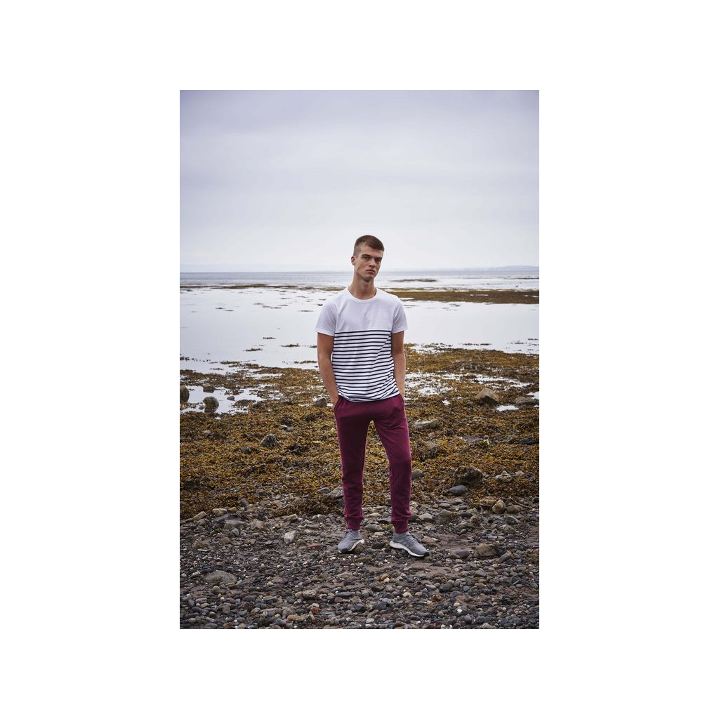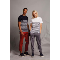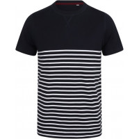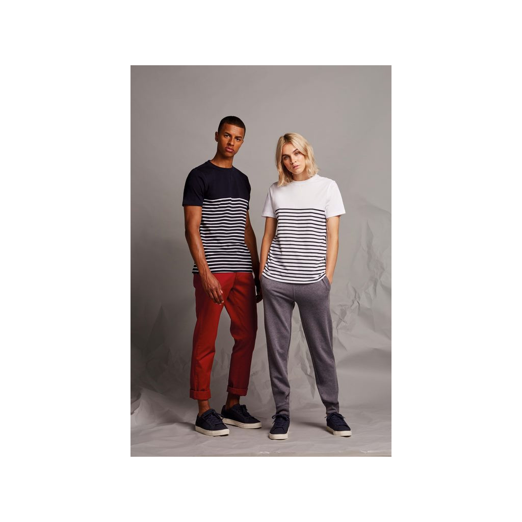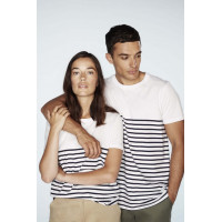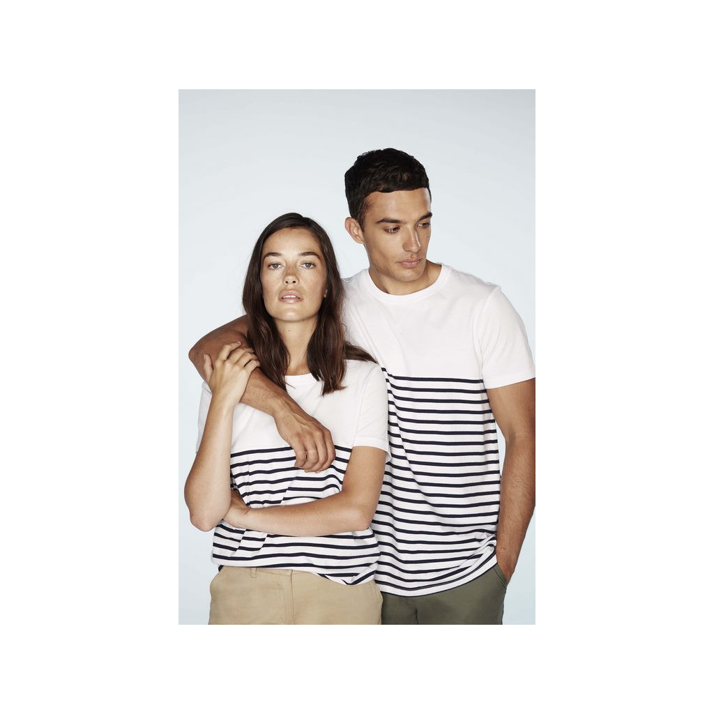 - Partie inférieure rayée contrastant avec le haut du corps et les manches unis.