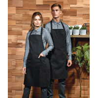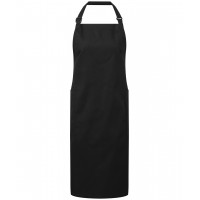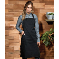 Tablier bavette épais pleine longueur personnalisable aux couleurs de votre enseigne en broderie ou impression. Il est fabriqué dans un mélange écologique de polyester recyclé et de coton biologique, pour ceux qui veulent démontrer leur engagement envers le développement durable.