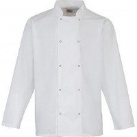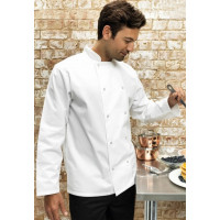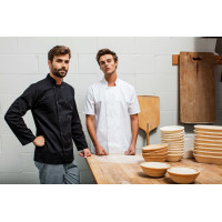 65% polyester / 35% coton twill. Doux au toucher. Veste facile à enlever grâce à ses boutons pressions. Col mao avec surpiqûres. Lavage industriel à 85°. Lavage domestique à 60°.