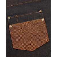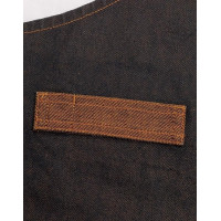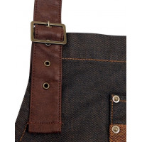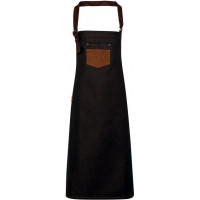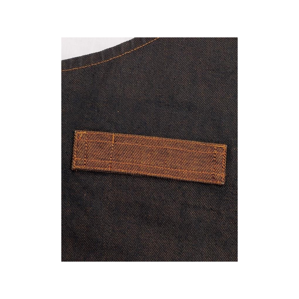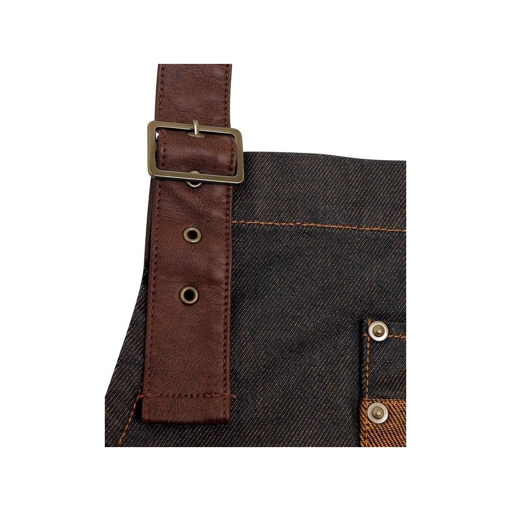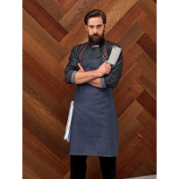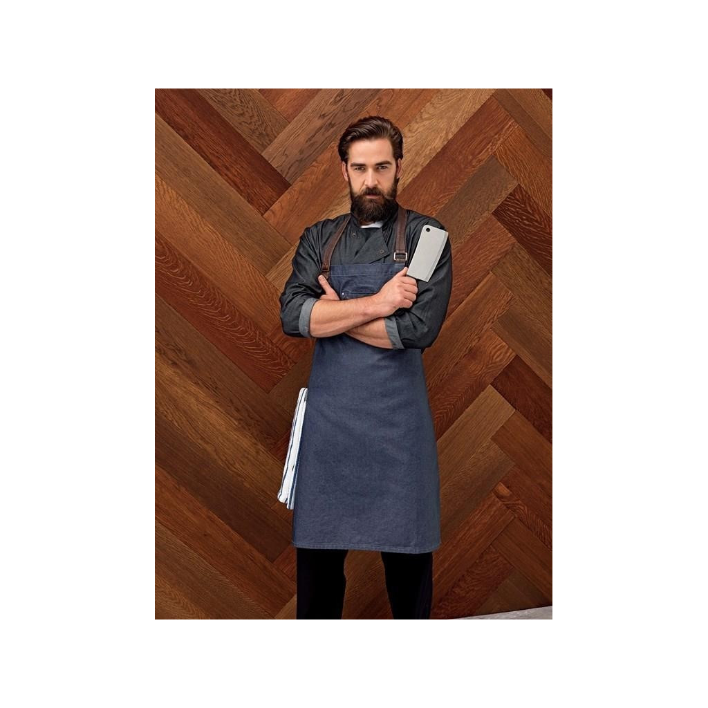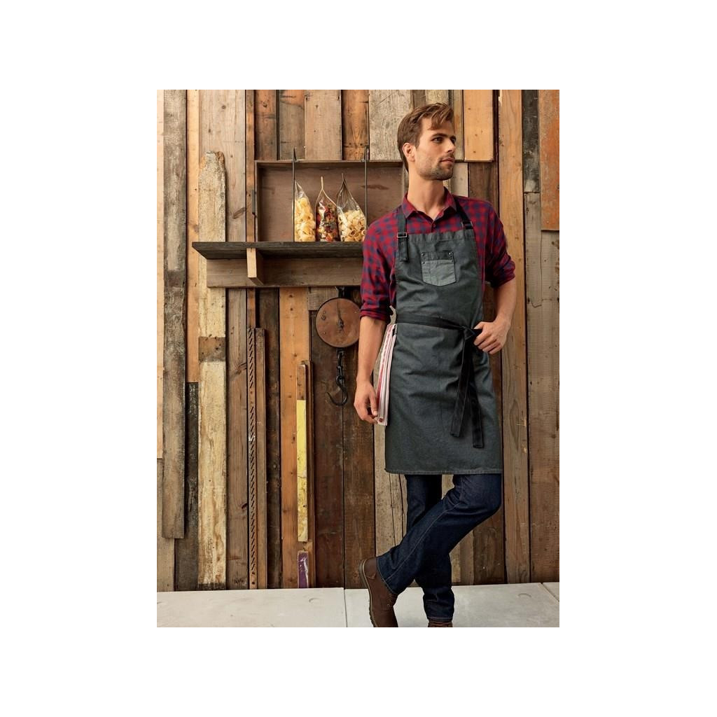 Tissu à l' effet denim teint grâce aux fils tissé-teint. Tablier à bavette au style vintage avec empiècements en tissu contrasté et détails en similicuir pour une apparence à la fois authentique et tendance, prisée dans bon nombre d'établissements.