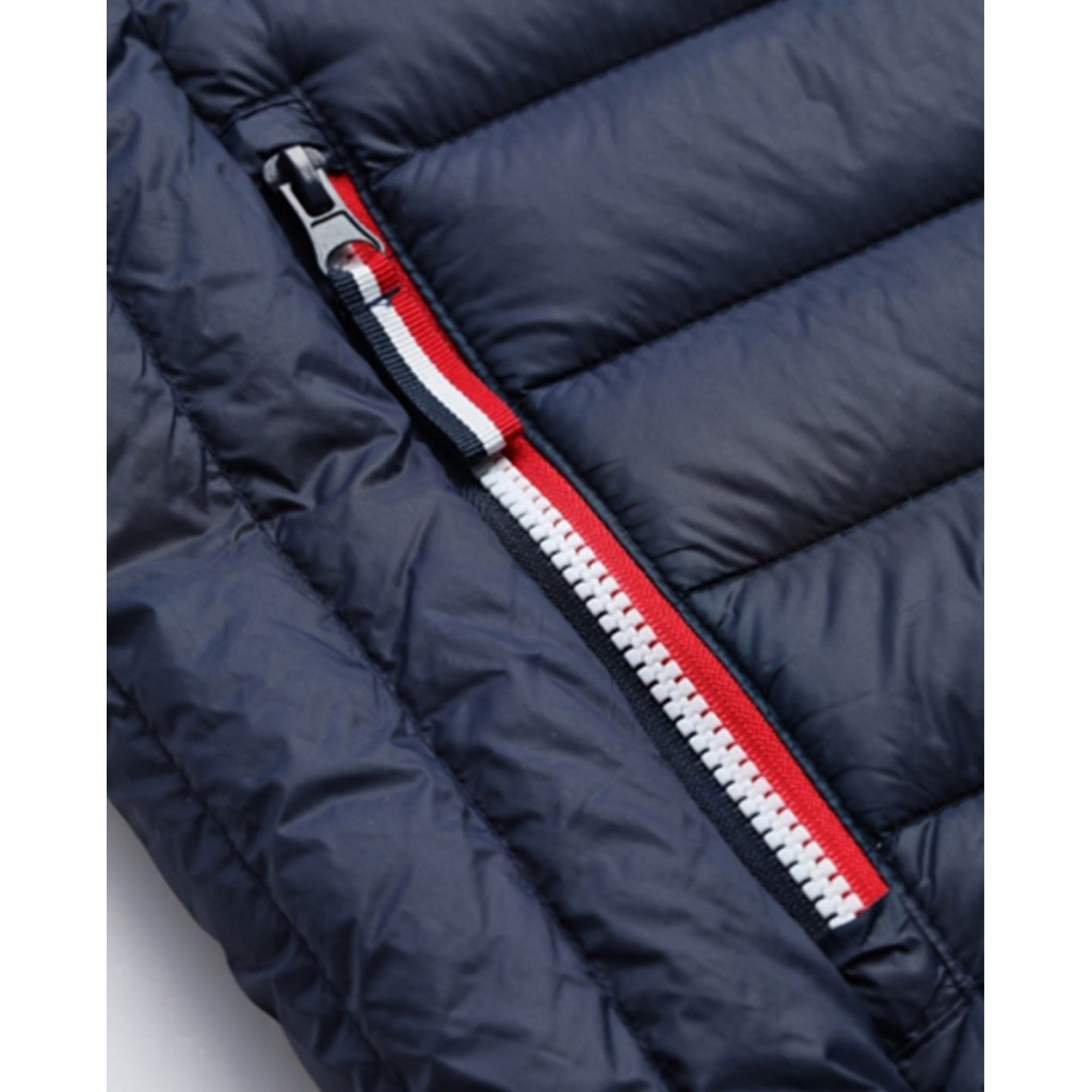 Pour l'hiver, personnalisez avec une broderie ce bodywarmer sans manches doudoune ultra léger avec détails tricolores pour Homme. Il vous tiendra bien chaud grâce à son matelassage 90% duvet, 10% plumes.