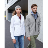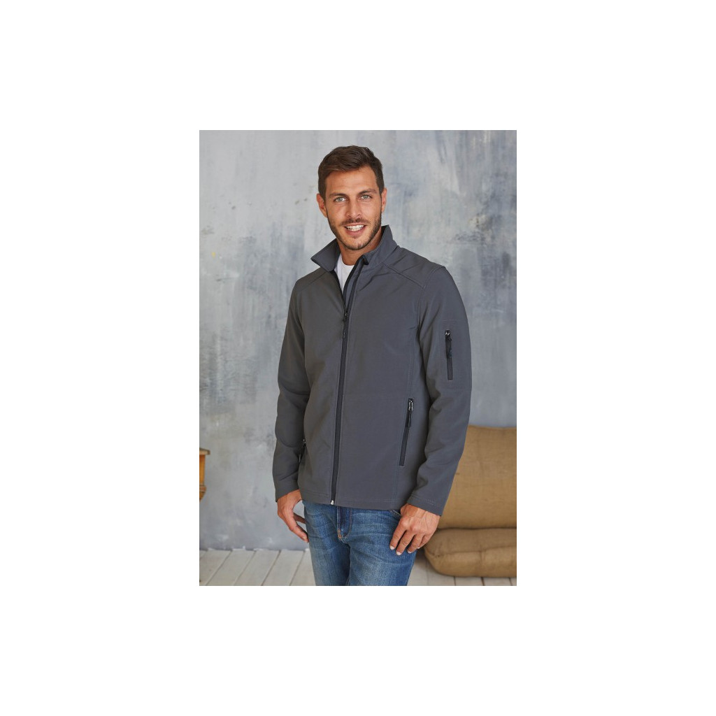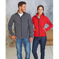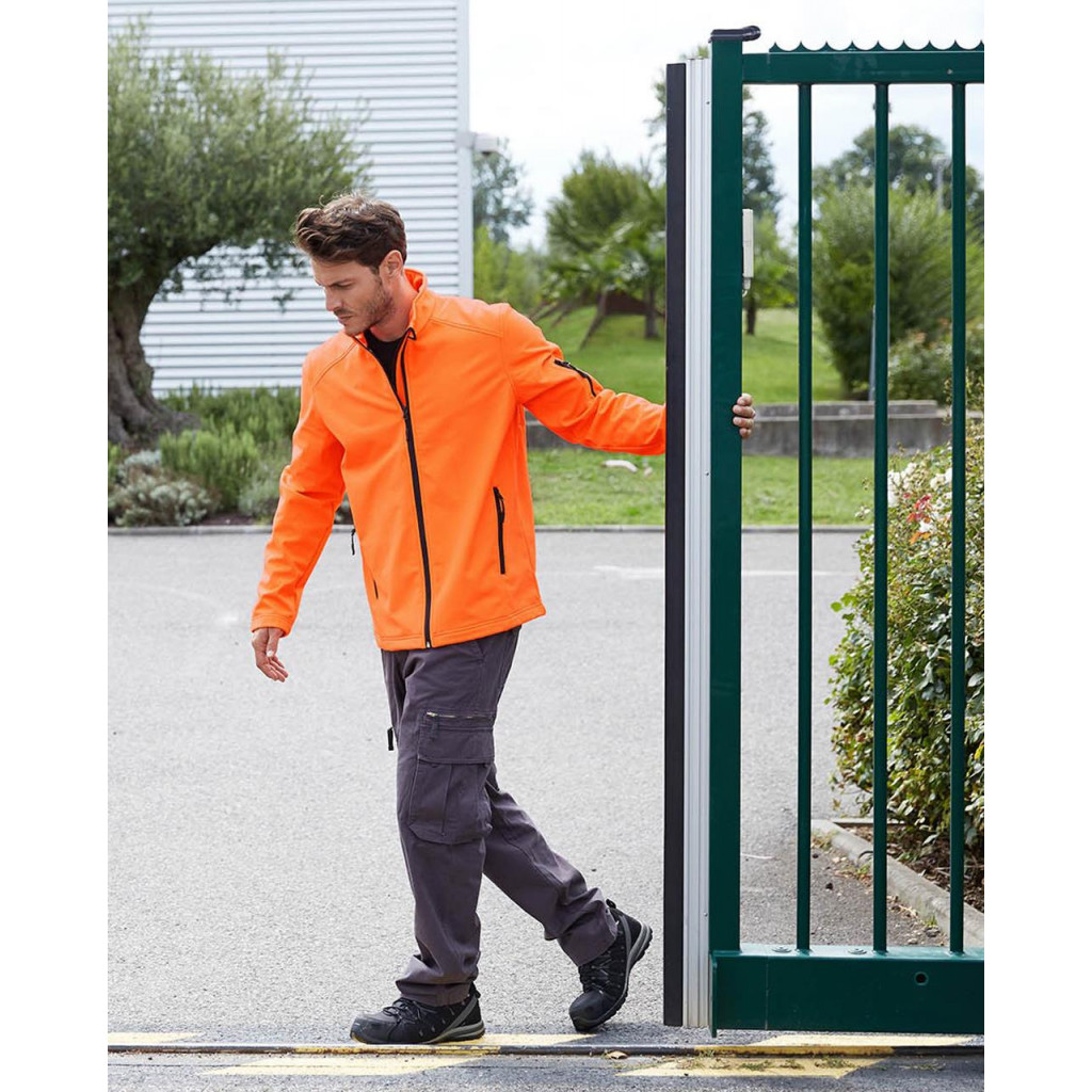 Veste softshell fluorescente composée à 95% polyester et 5% élasthanne.